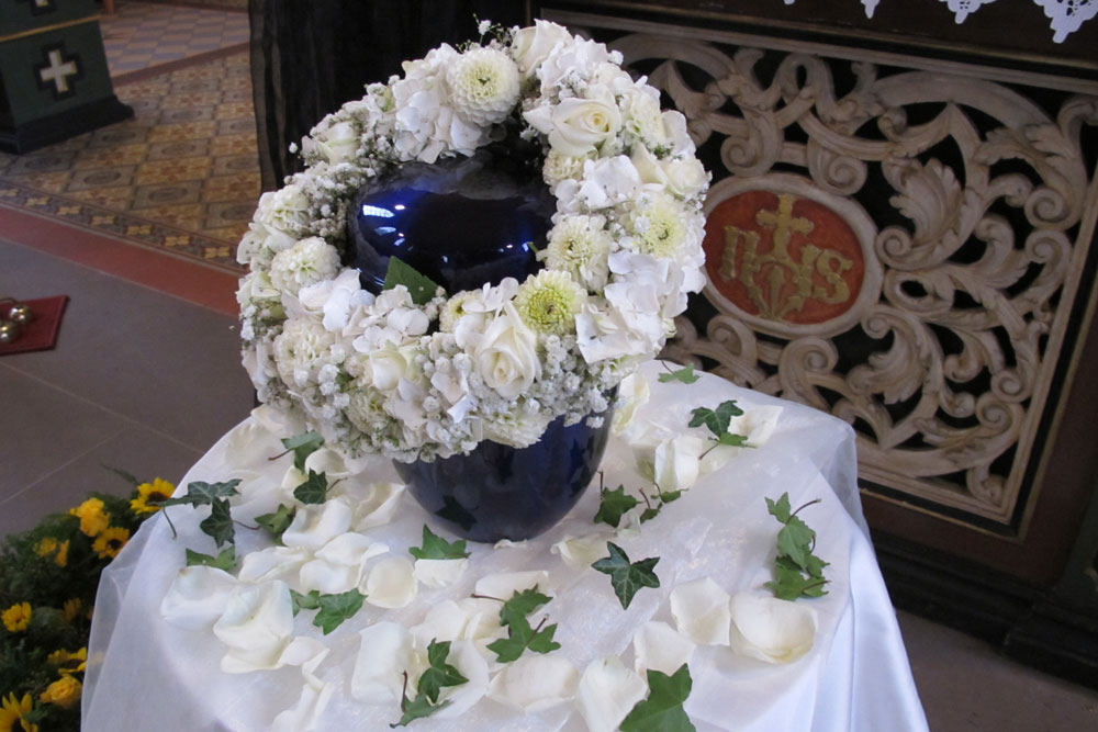Auf dem Friedhof selbst steht ein kleiner Pavillon. Dort wird die Urne aufgebahrt, bevor sie nach einer letzten Segnung beigesetzt wird. Bei Beisetzungen ohne Trauerfeier oder einer weltlichen Trauerfeier haben wir die Möglichkeit, Abschiedsworte zu sprechen, Musik zu spielen oder gemeinsam zu schweigen oder zu beten. Fragen Sie uns nach zertifizierten Trauerrednern.